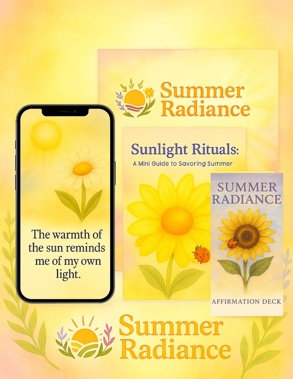 What’s Inside This Bundle Daily Dose of Joy GPT – Summer Radiance Edition Your AI-powered wellness companion, now updated for summer. Features seasonal affirmations, breath rituals, nature-inspired journaling prompts, and gentle reminders to stay present. Summer Radiance Affirmation Deck 24 printable affirmation cards with original art and gentle guidance. Use them as daily inspiration, digital backgrounds, or journaling prompts. Sunlight Rituals: A Mini Guide to Savoring Summer A calming, illustrated guide to seasonal rituals, herbal highlights, and small practices that bring peace and presence into your day. Summer Radiance Reflection Journal A 30-day guided journal with mood trackers, affirmations, and themed reflections. Designed for clarity, calm, and creative flow—all in an 8.5x11 printable format.